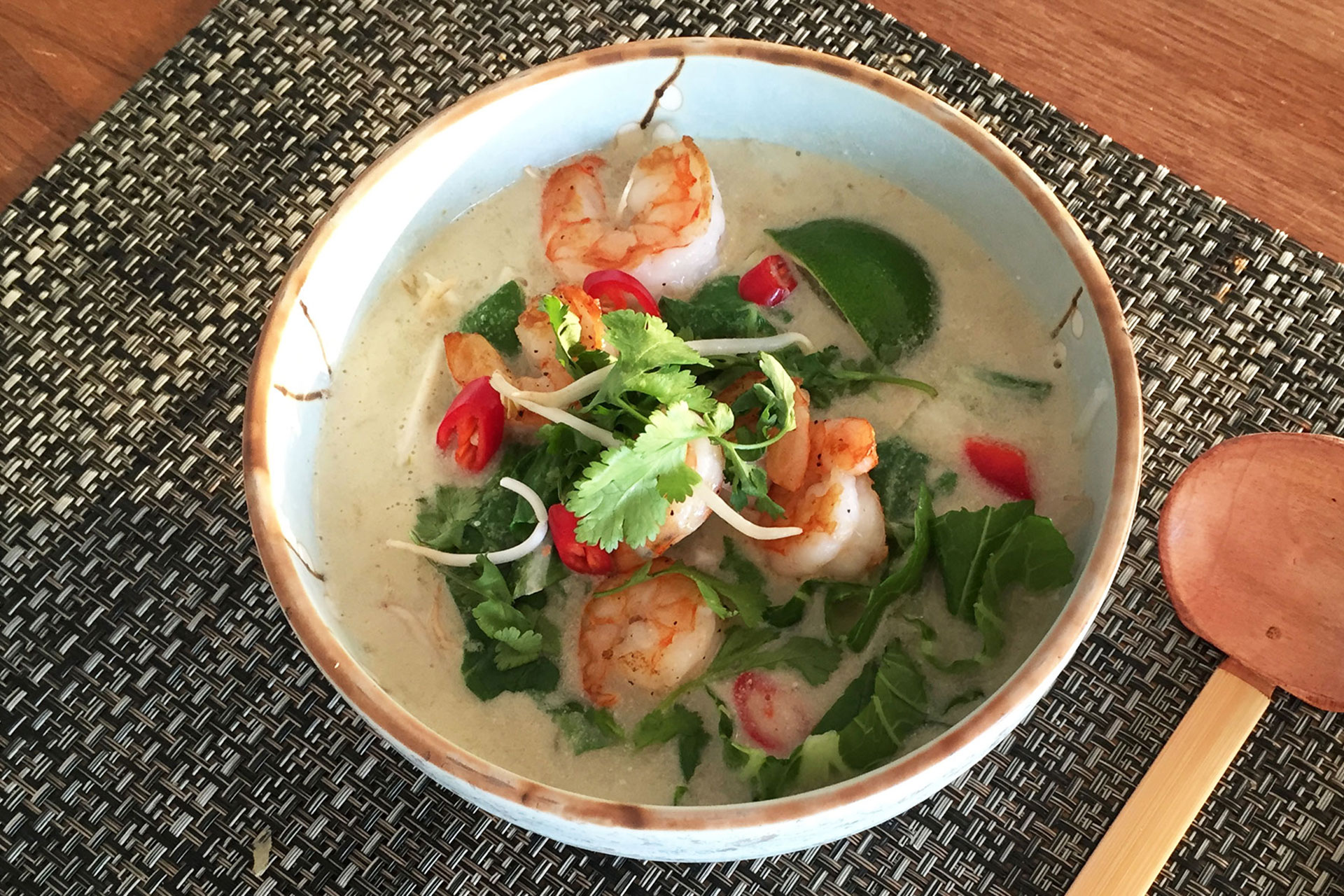 Pittige Oosterse maaltijdsoep met noedels en gamba’s