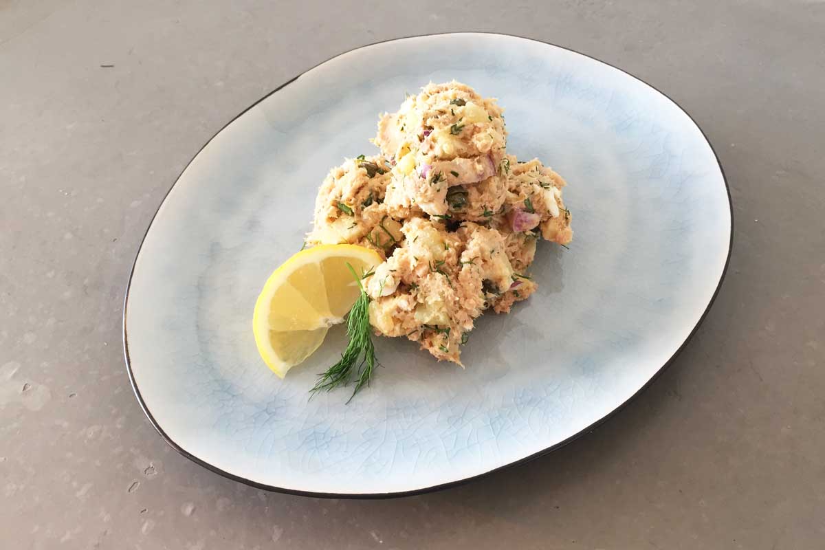 Nostalgisch zalmslaatje met appel, rode ui en dille