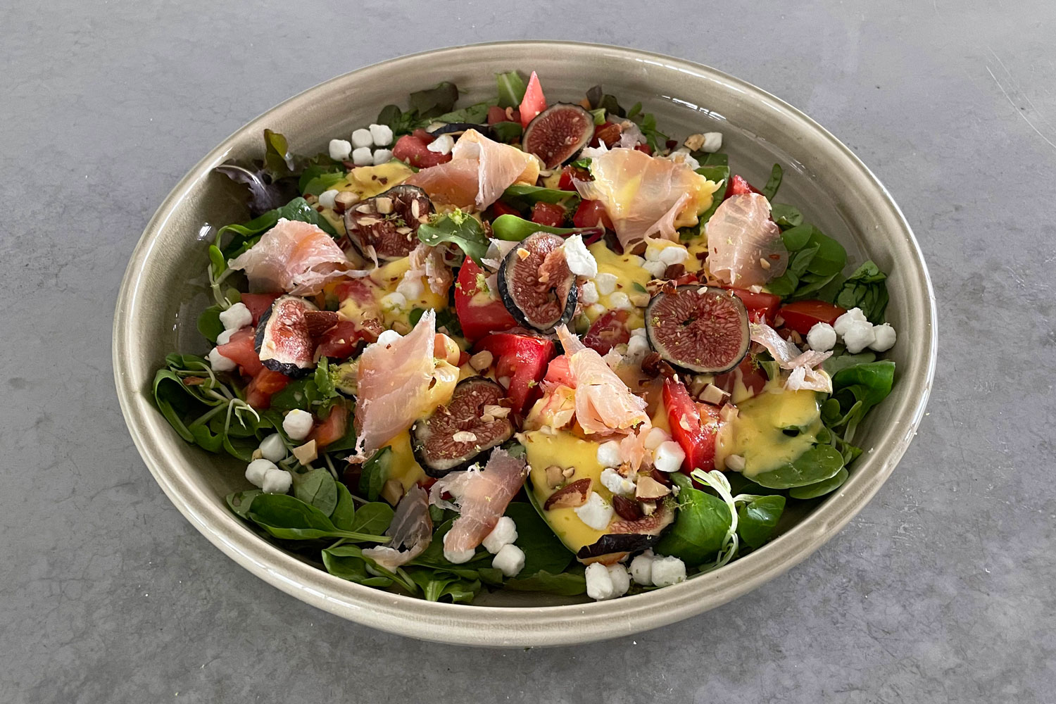 Spannende salade met vijgen, gerookte tonijn, geitenkaas en een zelfgemaakte mango dressing.