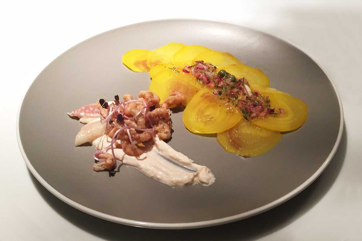 Een bordje vol Hollandse lekkernijen! Gele bietjes met een dressing van dille en kappertjes, Hollandse garnaaltjes met een mieriksworteldressing.