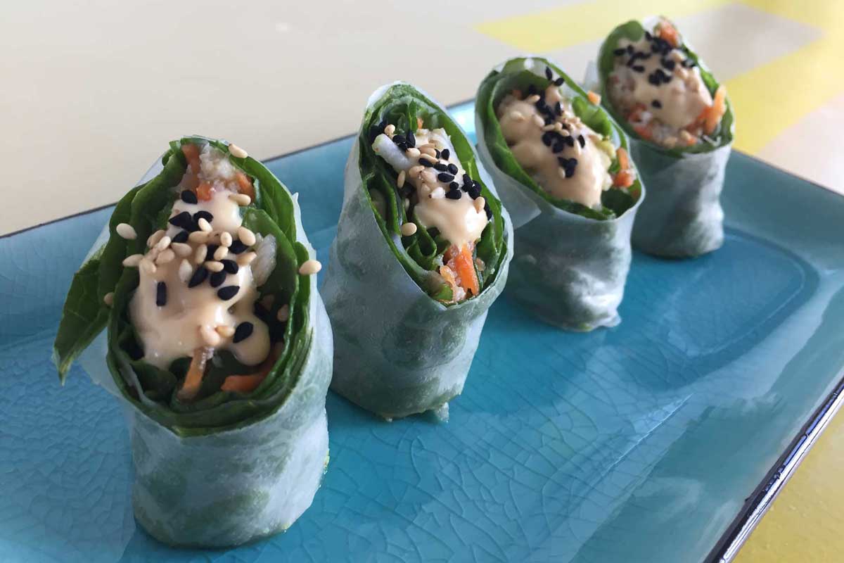 Oog- en tongstrelende rijstvel loempia's Californian Roll style, gevuld met krab, avocado, taugé en sla met een oosters getint mayosausje. Heerlijk licht, een perfect hapje of voorafje.