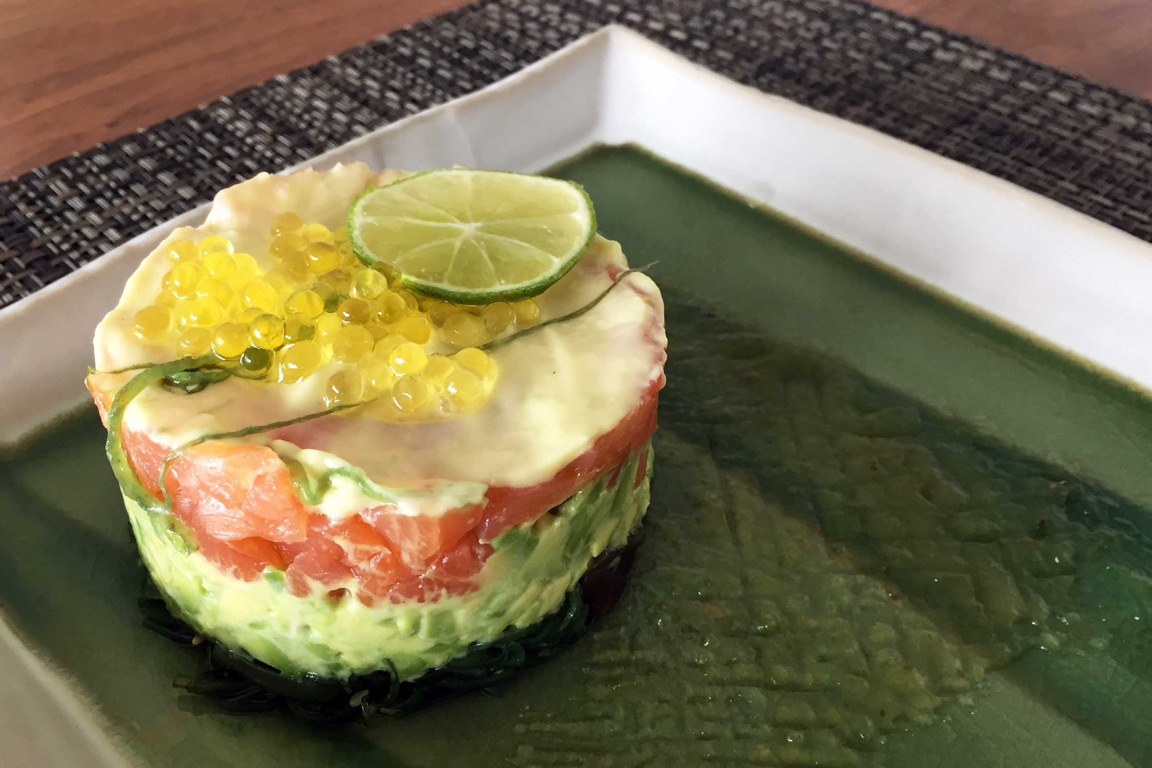 Zalmtartaartje met wakame, avocado, limoen en wasabi kaviaar