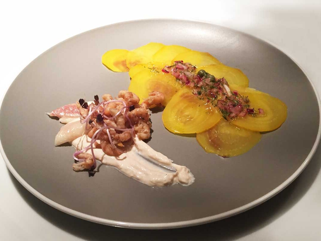 Een bordje vol Hollandse lekkernijen! Gele bietjes met een dressing van dille en kappertjes, Hollandse garnaaltjes met een mieriksworteldressing.