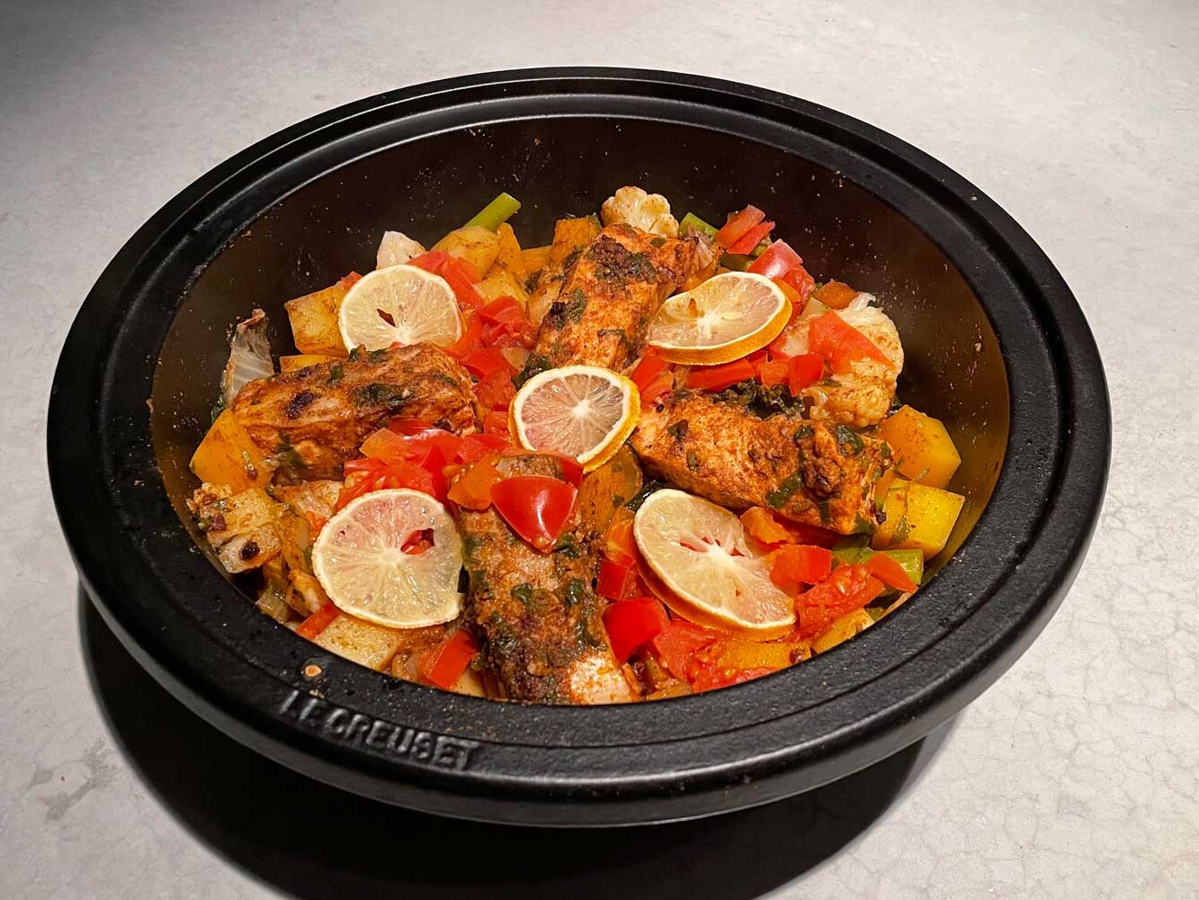 Verse zalm, een bonte selectie aan groenten en een goede specerijenmix. De tajine doet de rest.