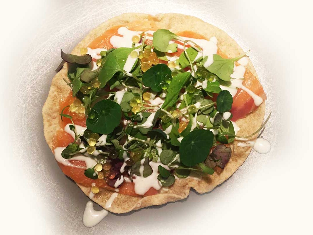 Haute cuisine in 10 minuten! Gerookte zalm, micro salade, Oostindische kers, wasabidressing en wasabiparels op een pappadum.