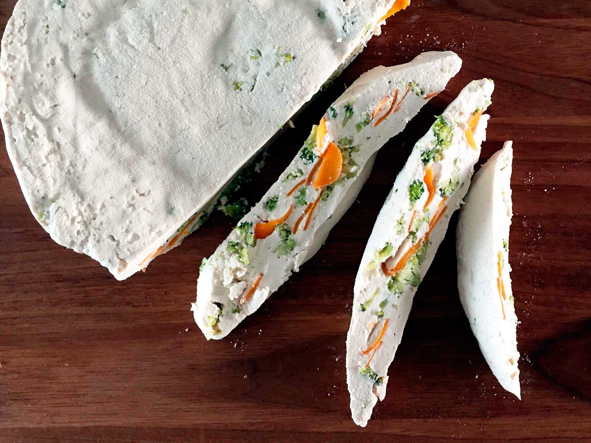 Een spectaculaire zelfgemaakte tofu, kleurrijk en extra smaakvol door de toegevoegde groenten. Tofu is een eiwitrijk product van sojabonen, een ideale vervanger voor vlees.