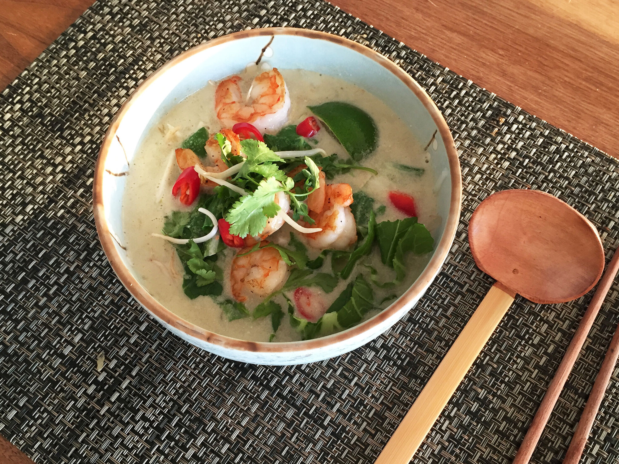 Pittige Oosterse maaltijdsoep met noedels en gamba’s
