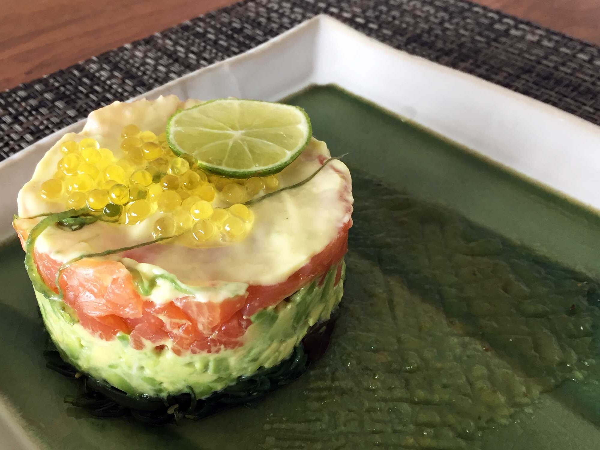 Feestelijk zalmtartaartje op een bedje van wakame en pittige avocadosalade, gegarneerd met frisse limoenmayonaise en wasabi kaviaar
